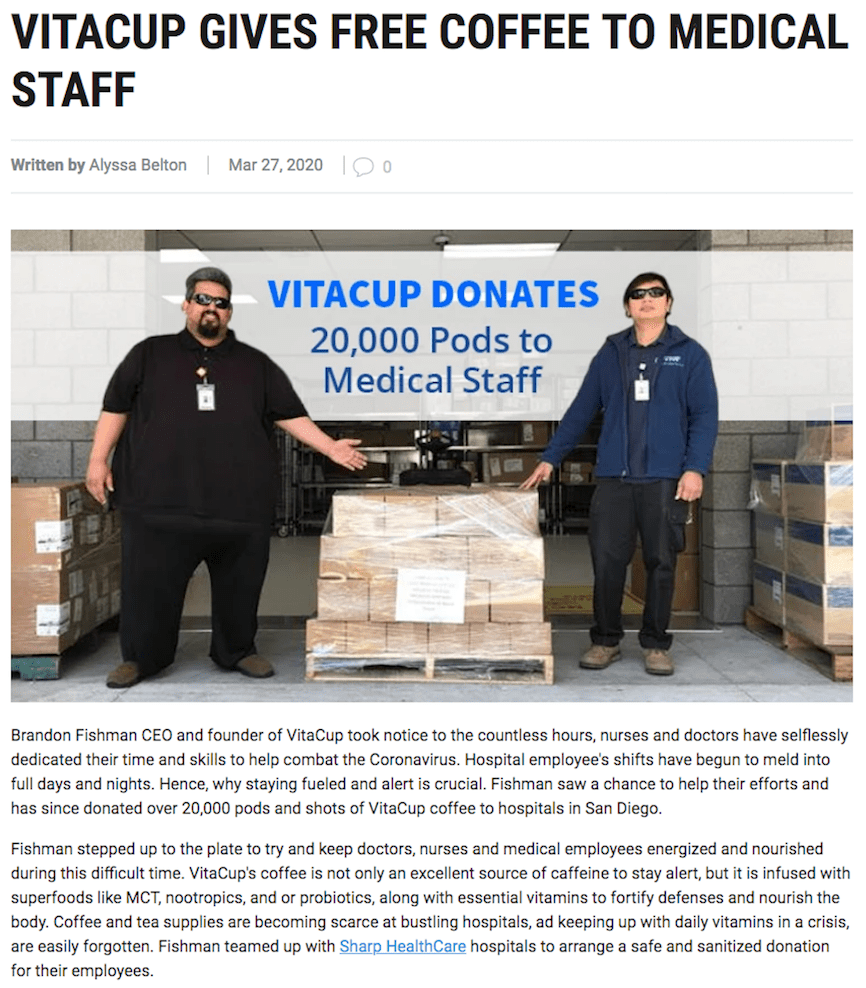 At the start of the pandemic VitaCup donated coffee to medical staff in the southern California. I drafted this post which was shared on their social channels and Linkedin.