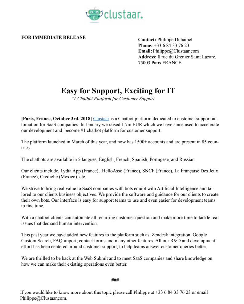 I crafted a press release for Clustaar a tech company based in Paris. They fundraised a substantial amount of capital to push their