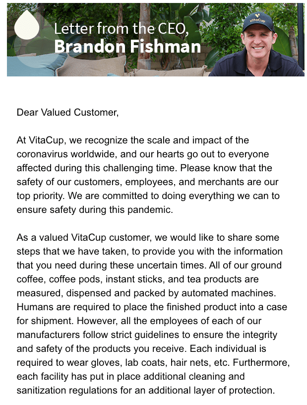 At the start of the pandemic, the VitaCup team wanted to reassure current customers and recurring subscribers that we were adhering to safety guidelines. I drafted this letter from the CEO, which was sent to the entirety of our consumer base.