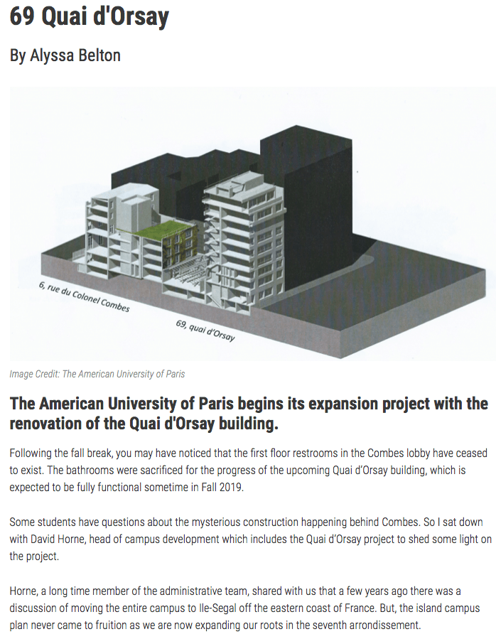 During my time at the American University of Paris I was a staff writer for the Peacock Plume. I wrote this article about the upcoming addition to the school campus.